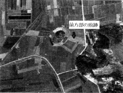 問題の航空写真は、1961年5月6日、上空1900mから撮影されたもので、小山遺跡の東南に巾40mほどの「前方部」の痕跡が認められた(図1)。更に、小山遺跡の周囲は巾20mほどの周濠の痕跡のような地割が確認され、小山遺跡の丘を後円部とすると、後円部直径約50m、前方部長さ推定60m、全長推定110mの前方後円墳が復元できる。