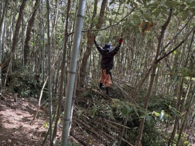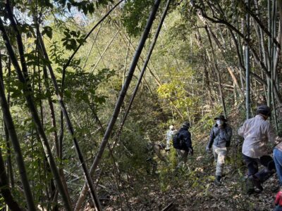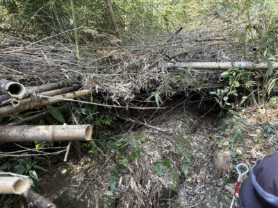 3月に開催した会議で定めた推定地調査方針にしたがって、水門があったとされる場所の地表面観察調査にむけて、進入路と観察地点の整備作業を実施しました。