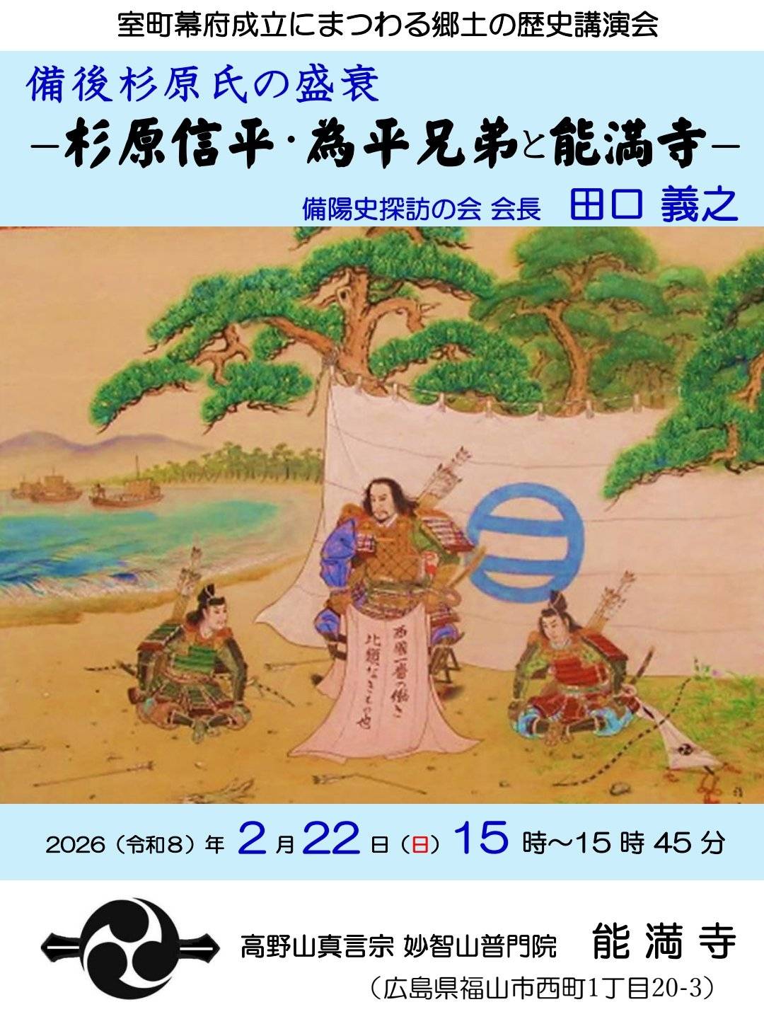 歴史講演会「杉原信平・為平兄弟と能満寺」開催のお知らせ 備陽史探訪の会 2026-01-12T18:34:28+09:002026年1月12日 歴史講演会「杉原信平・為平兄弟と能満寺」開催のお知らせ2026-01-12T18:34:54+09:00管理人 事務局だより能満寺様で田口会長の講演会が開催されます。 なお、本行事は備陽史探訪の会のものではなく、能満寺様の主催ですので、お問い合わせ等は能満寺様までお願いいたします。 https://bingo-history.net/archives/30621https://bingo-history.net/wp-content/uploads/2026/01/18142-768x1024.jpghttps://bingo-history.net/wp-content/uploads/2026/01/18142-150x100.jpg2026-01-12T18:34:28+09:00管理人事務局だより能満寺様で田口会長の講演会が開催されます。 なお、本行事は備陽史探訪の会のものではなく、能満寺様の主催ですので、お問い合わせ等は能満寺様までお願いいたします。管理人 tanaka@pop06.odn.ne.jpAdministrator備陽史探訪の会Tweetこの記事のあとによく読まれています! 杉原信平・為平兄弟能満寺出陣法要のご案内 歴史講演会「室町幕府と備後」 足利義昭の上國について『歴史講演会』開催! 【歴史講演会】大飛島遺跡から見た瀬戸内の古代 大正期の芦田川洪水と福山義倉の救済【歴史講演会】開催 【歴史講演会】弥生から古墳時代の出雲と吉備の葬送儀礼 三次盆地の古墳時代【歴史講演会】&望年会 歴史講演会・望年会無事終了